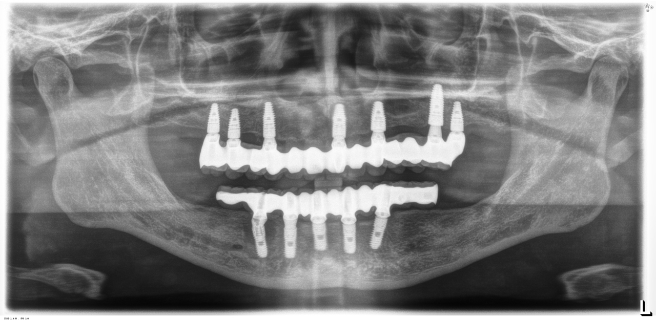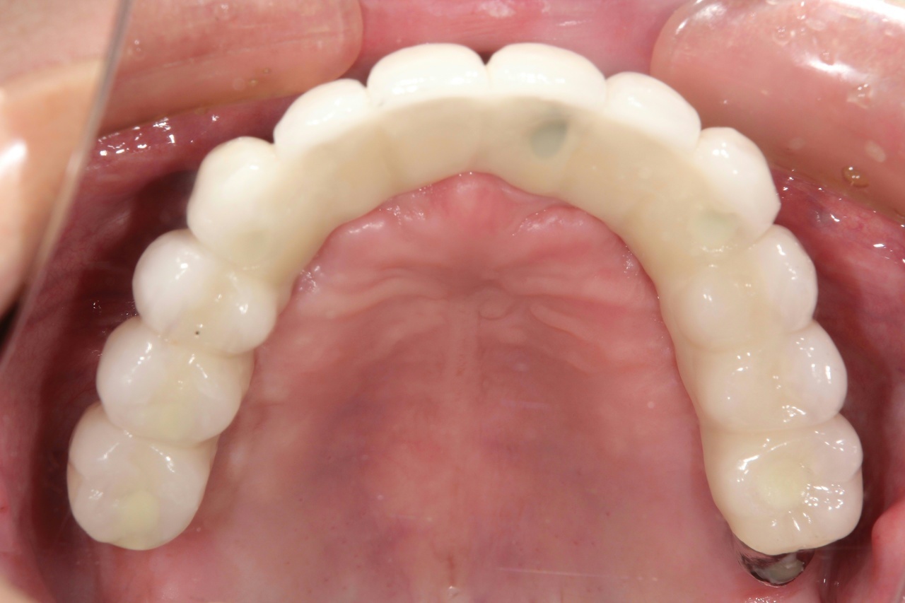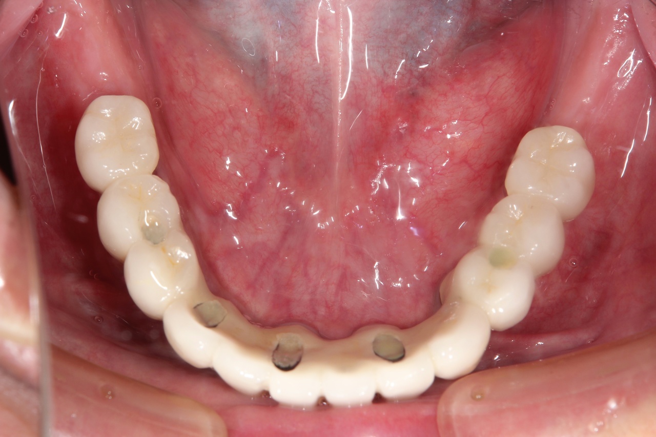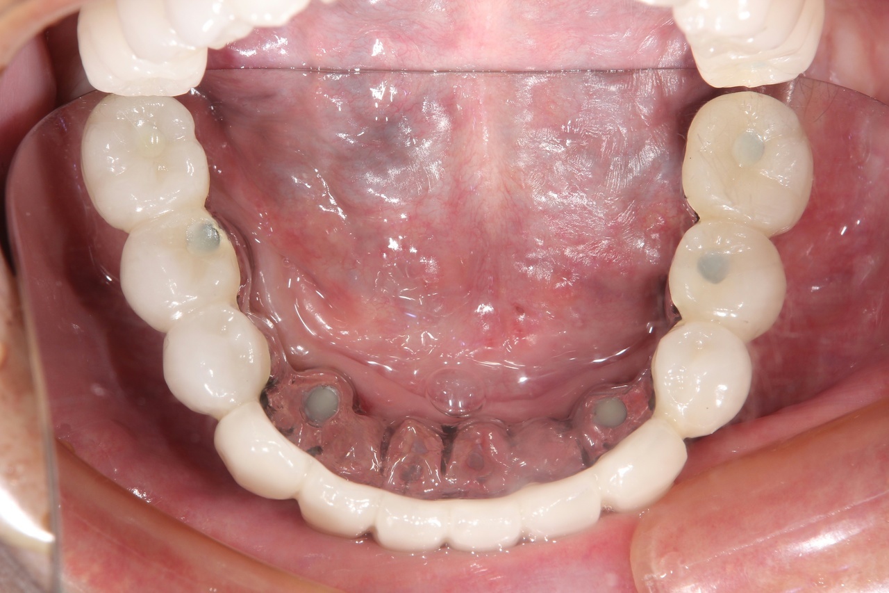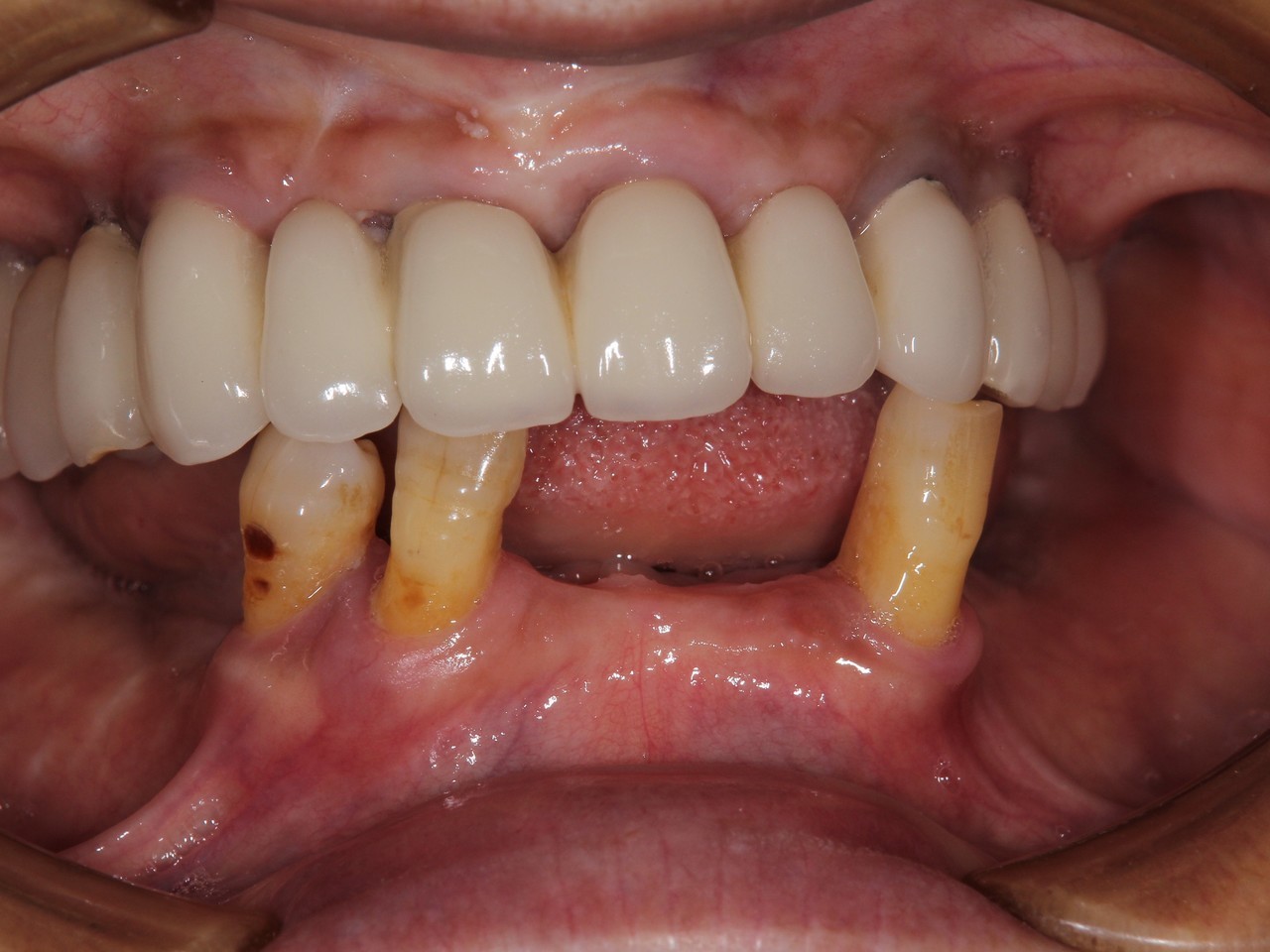 7本のインプラントを埋入し、12本の歯を並べています。面長で奥行きが長い顔の方の場合、前歯部に1本インプラントを追加することで、咬合の安定を図ります。