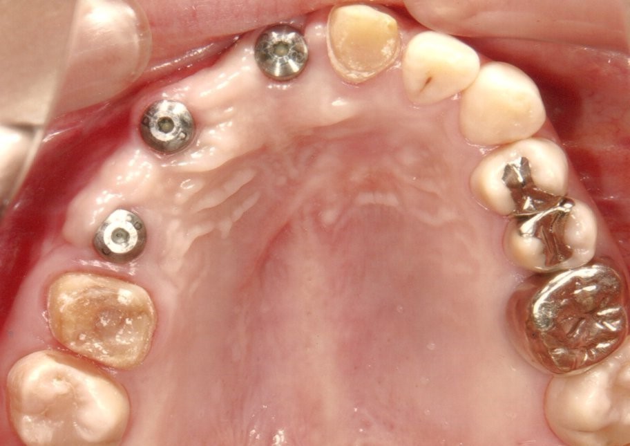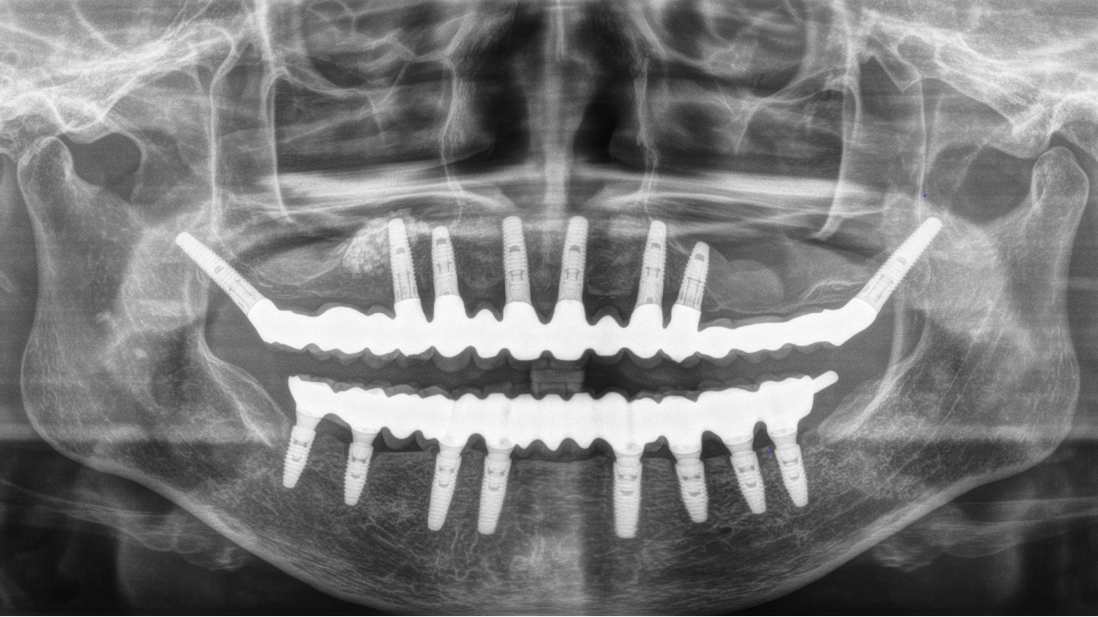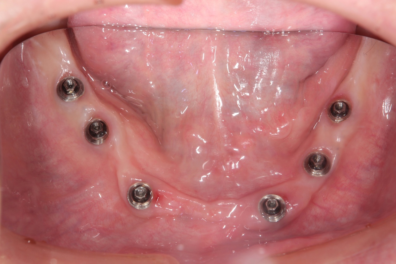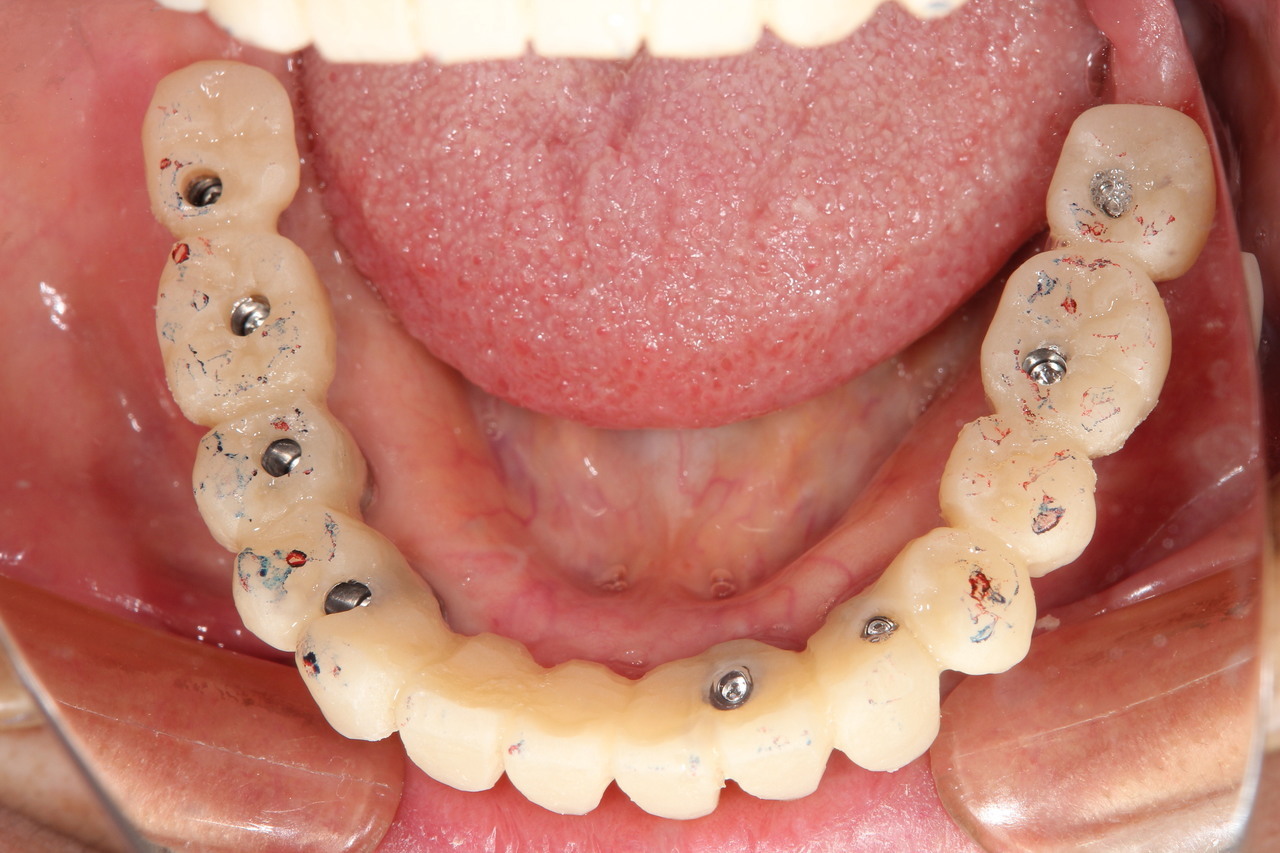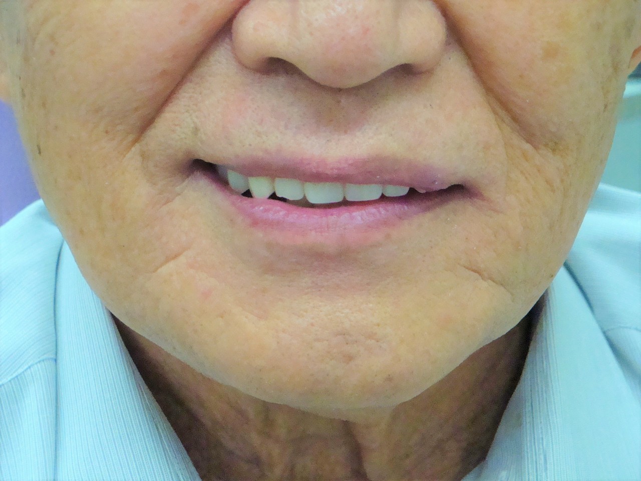 7本のインプラントを埋入し、12本の歯を並べています。面長で奥行きが長い顔の方の場合、前歯部に1本インプラントを追加することで、咬合の安定を図ります。