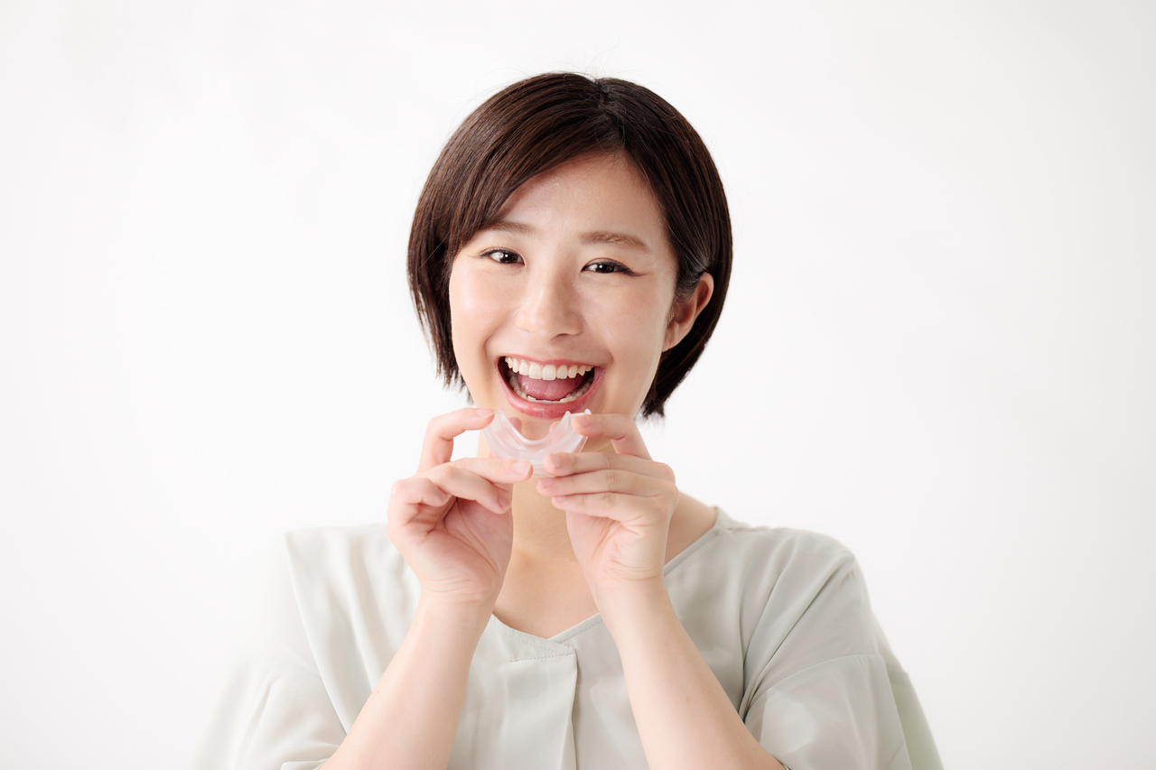 歯ぎしり・食いしばり・噛みしめる事により、歯が痛むことを防止するためのマウスピースです。特に夜間の就寝中はご自身で力のコントロールができないため、起きている時よりも過大な力が掛かることは知られています。そのため、就寝中にナイトガードを装着する事が推奨されます。