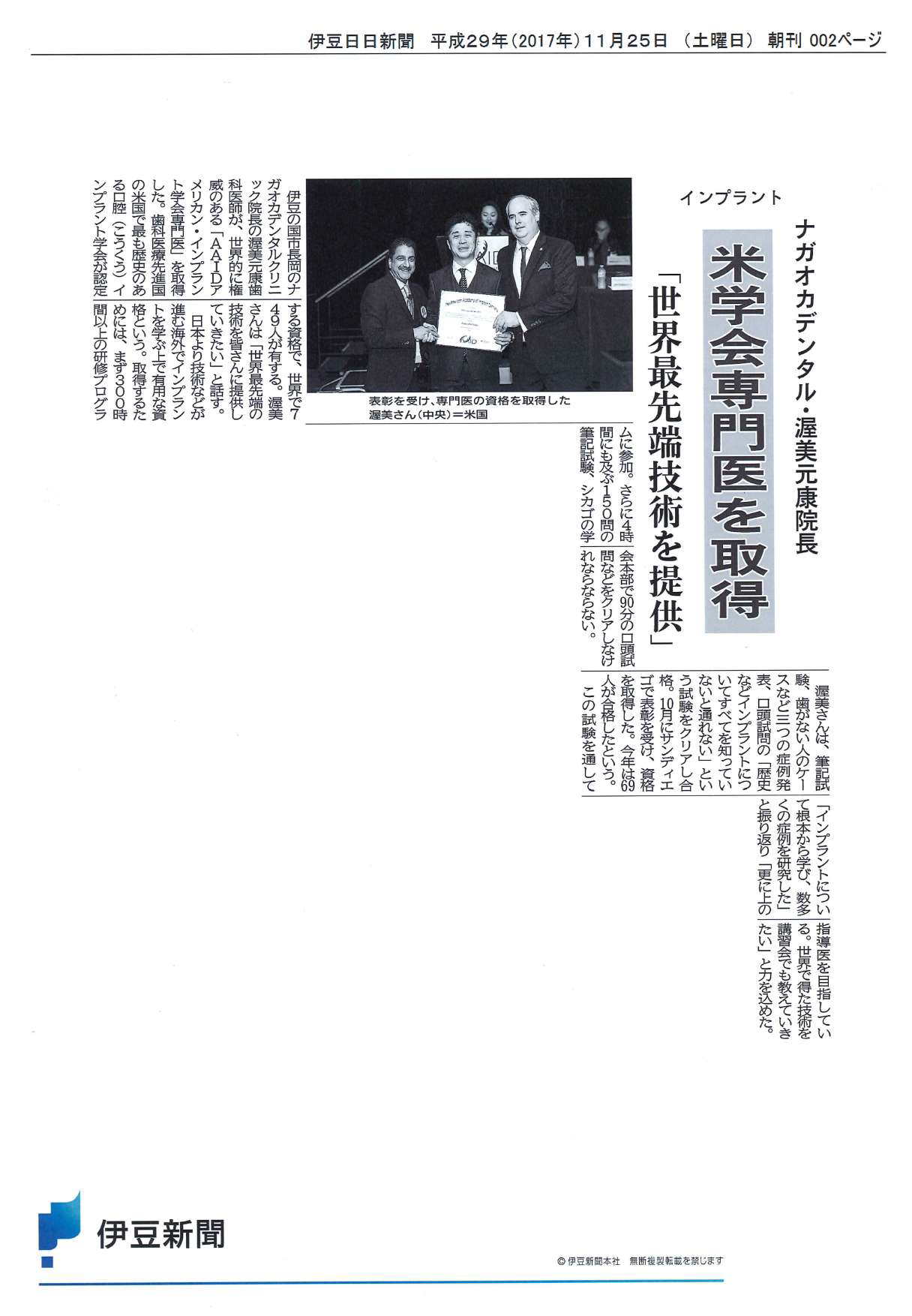 伊豆の国市長岡のナガオカデンタルクリニック院長の渥美元康歯科医師が、世界的に権威のある「AAIDアメリカ・インプラント学会専門医」資格を取得した。歯科医療先進国の米国で最も歴史のある口腔(こうくう)インプラント学会が認定する資格で、世界で749人が有する。渥美さんは「世界最先端の技術を皆さんに提供していきたい」と話す。