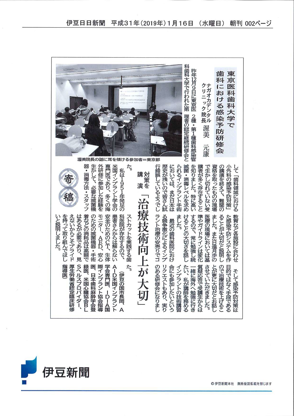 私は1951年発足の米国インプラント学会の専門医であり、多くの海外研修に参加した経験を生かして、必要な滅菌機器・消毒方法・スタッフ教育など各施設に合わせた感染予防システムを作ることが大切だと説明しました。また日進月歩の医療の現場においては基準やガイドラインは変化するので、常に勉強し続けることの大切さを話しました。