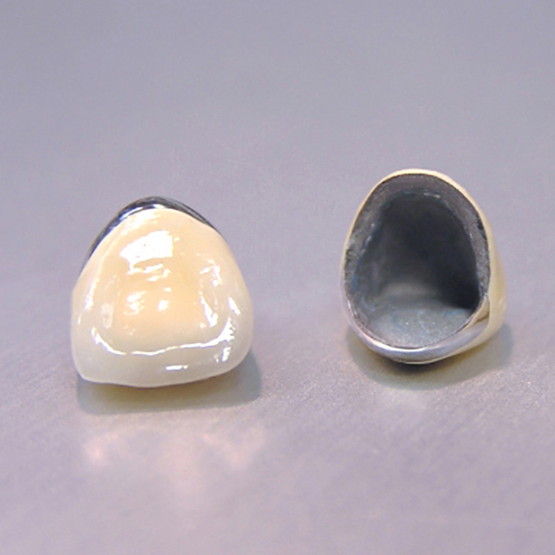 金属製の被せ物の外側に、白いセラミックを焼きつけて作製する被せ物です。内側に金属を使っているため丈夫な点が特徴です。