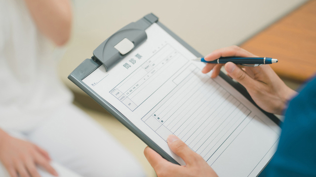 ご来院されましたら、受付へお越しください。保険証のご提示と問診票への記入をお願いします。再診の患者さまは診察券のご提示のみで結構です。